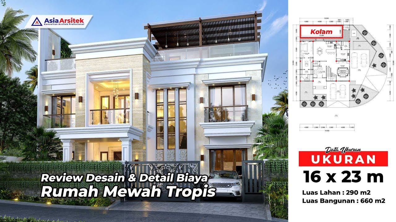 Review Desain Detail Biaya Bangun Rumah Mewah Tropis Modern 3 Lantai di lahan 16x23 meter.
